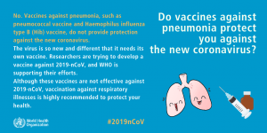 آیا واکسن های ضد پنومونی شما را در برابر ویروس کرونا جدید محافظت میکنند؟واکسنها علیه پنومونی، مانند واکسن پنوموکوکی و واکسن Haemophilus آنفلوانزا نوع B (Hib)، محافظت در برابر coronavirus جدید نیست. ویروس آنقدر جدید و متفاوت است که به واکسن خاص خود نیاز دارد. محققان در تلاشند تا واكسن علیه ۲۰۱۹-nCoV تهیه كنند و سازمان بهداشت جهانی از تلاشهای آنها حمایت میكند. اگرچه این واکسنها در برابر ۲۰۱۹-nCoV مؤثر نیستند ، اما واکسیناسیون در برابر بیماری های تنفسی برای محافظت از سلامتی شما بسیار توصیه می شود.