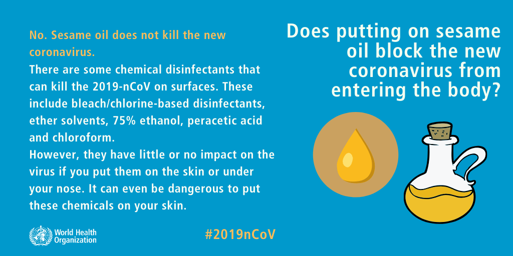 آیا قرار دادن روغن کنجد باعث جلوگیری از ورود coronavirus جدید به بدن نمی شود؟روغن کنجد کورونا ویروس جدید را از بین نمی برد. برخی از ضد عفونی کنندههای شیمیایی وجود دارند که می توانند ۲۰۱۹-nCoV را بر روی سطوح بکشند. اینها شامل ضد عفونی کننده های مبتنی بر کلر یا حلالها، ۷۵٪ اتانول، اسید پراستریک و کلروفرم است. با این حال، اگر آنها را روی پوست یا زیر بینی خود قرار دهید، تأثیر کمی یا تاثیر آن بر ویروس ندارند. حتی میتواند خطرناک باشد که این مواد شیمیایی را روی پوست خود قرار دهید.