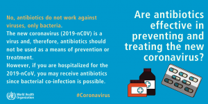 آیا آنتی بیوتیکها در جلوگیری و معالجه کورونا ویروس جدید مؤثر هستند؟خیر، آنتی بیوتیکها تاثیری بر روی ویروس ندارند و فقط در برابر باکتریها موثرند. ویروس کرونا جدید (۲۰۱۹-nCoV) یک ویروس است و بنابراین، نباید از آنتی بیوتیکها به عنوان ابزاری برای پیشگیری یا درمان استفاده شود. با این حال، اگر شما در بیمارستان ۲۰۱۹-nCoV بستری هستید، ممکن است آنتی بیوتیک دریافت کنید زیرا عفونت باکتریایی امکان پذیر است.