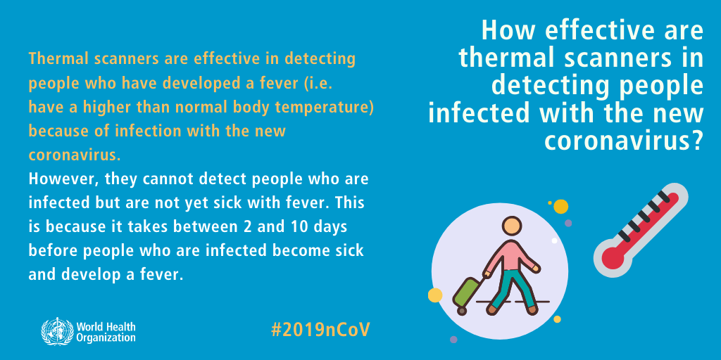 اسکنرهای حرارتی در تشخیص افرادی که دچار تب هستند(یعنی درجه حرارت بالاتر از حد طبیعی بدن است) به دلیل عفونت با کروناویروس جدید موثر هستند. با این حال، آنها نمی توانند افرادی را که آلوده هستند و هنوز به تب مبتلا نیستند، تشخیص دهند. این امر به این دلیل است که بین ۲ تا ۱۰ روز طول می کشد تا افرادی که آلوده می شوند بیمار شوند و دچار تب شوند.